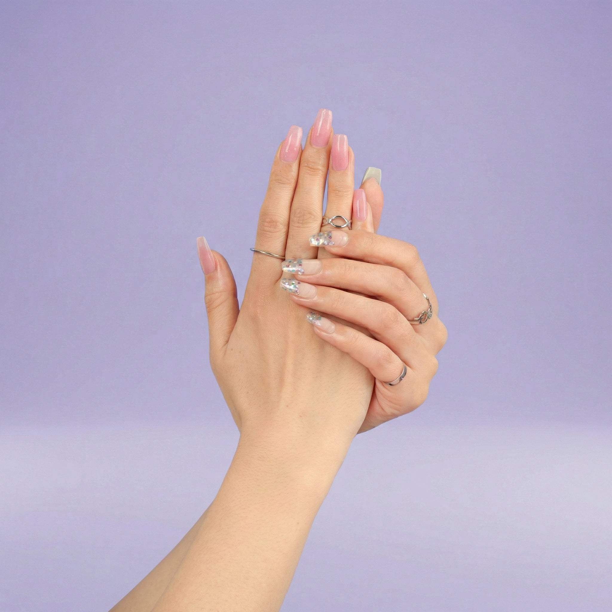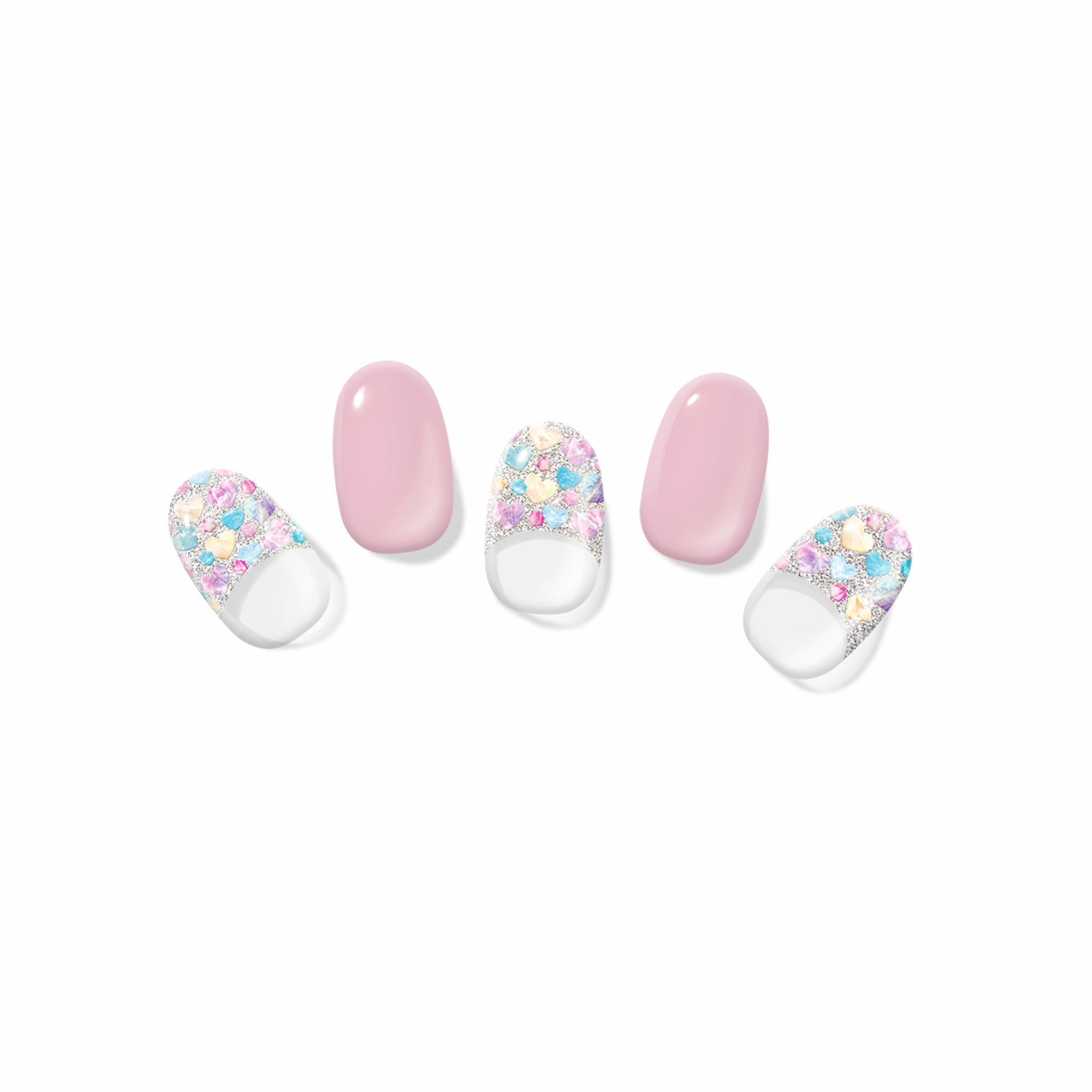 Soft pink solids alternating with white-tipped nails piled high with pastel heart gems and iridescent stones. French Heart takes a classic base and covers it in something completely unserious — in the best way. For when you want your nails to look like a love letter wrote itself.