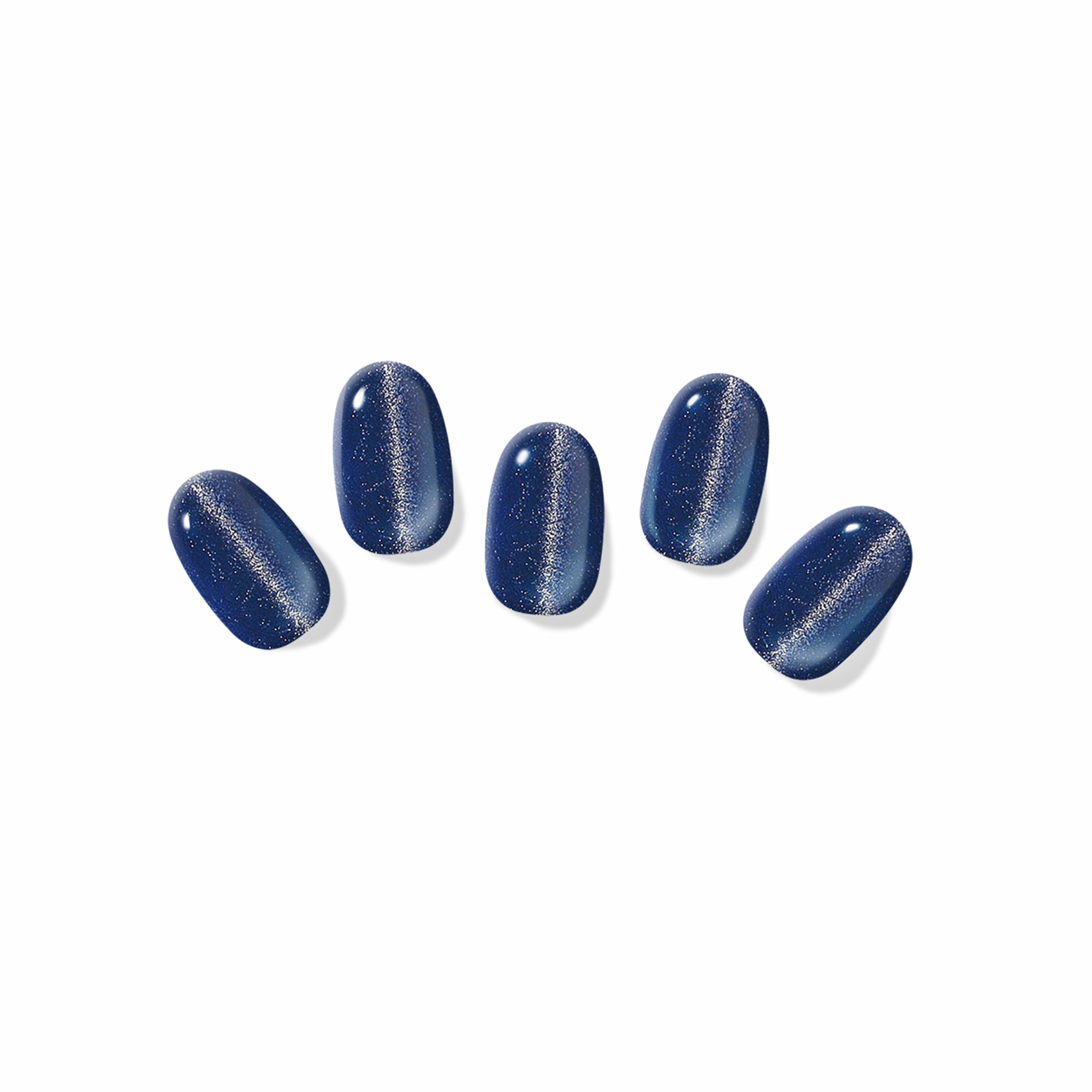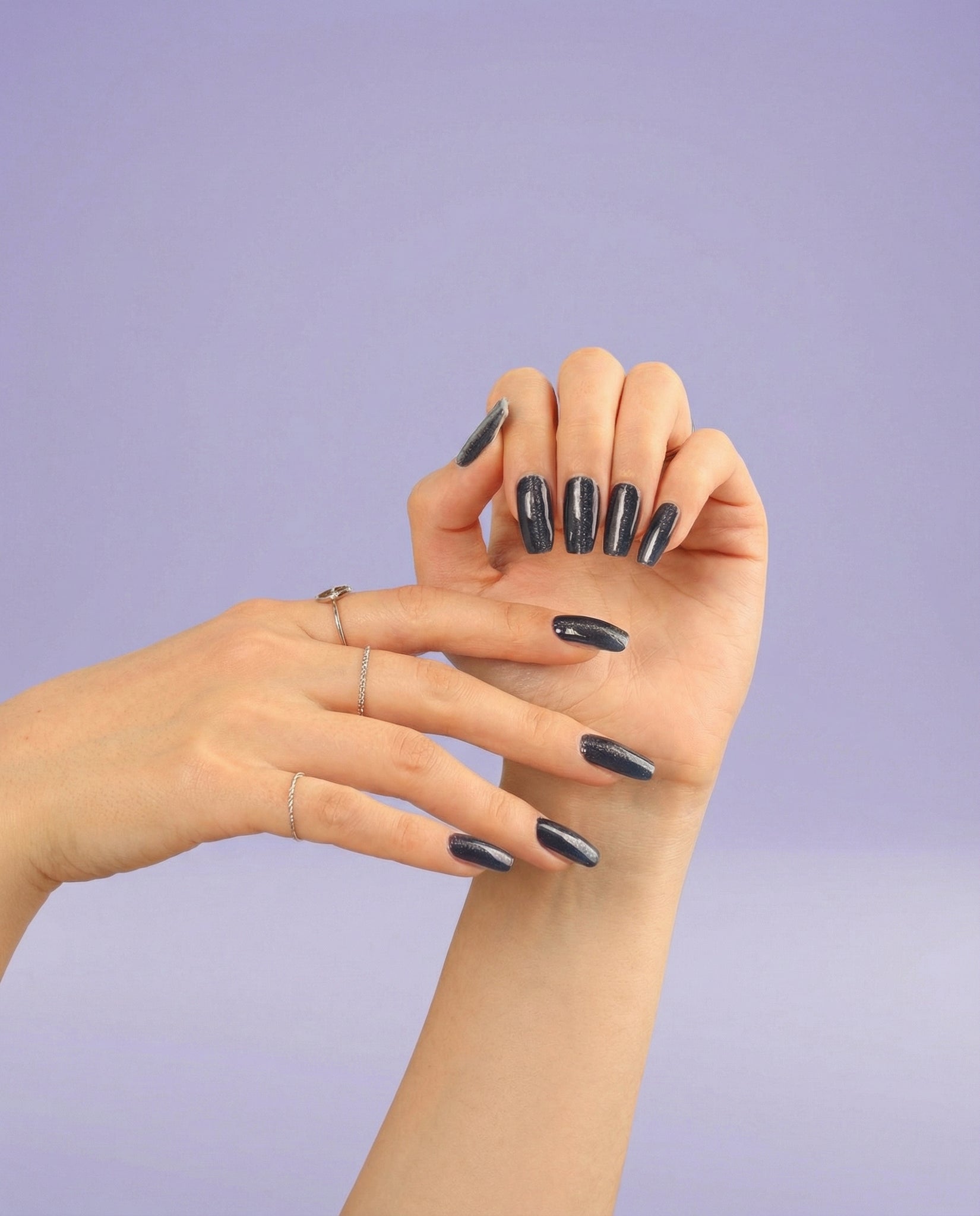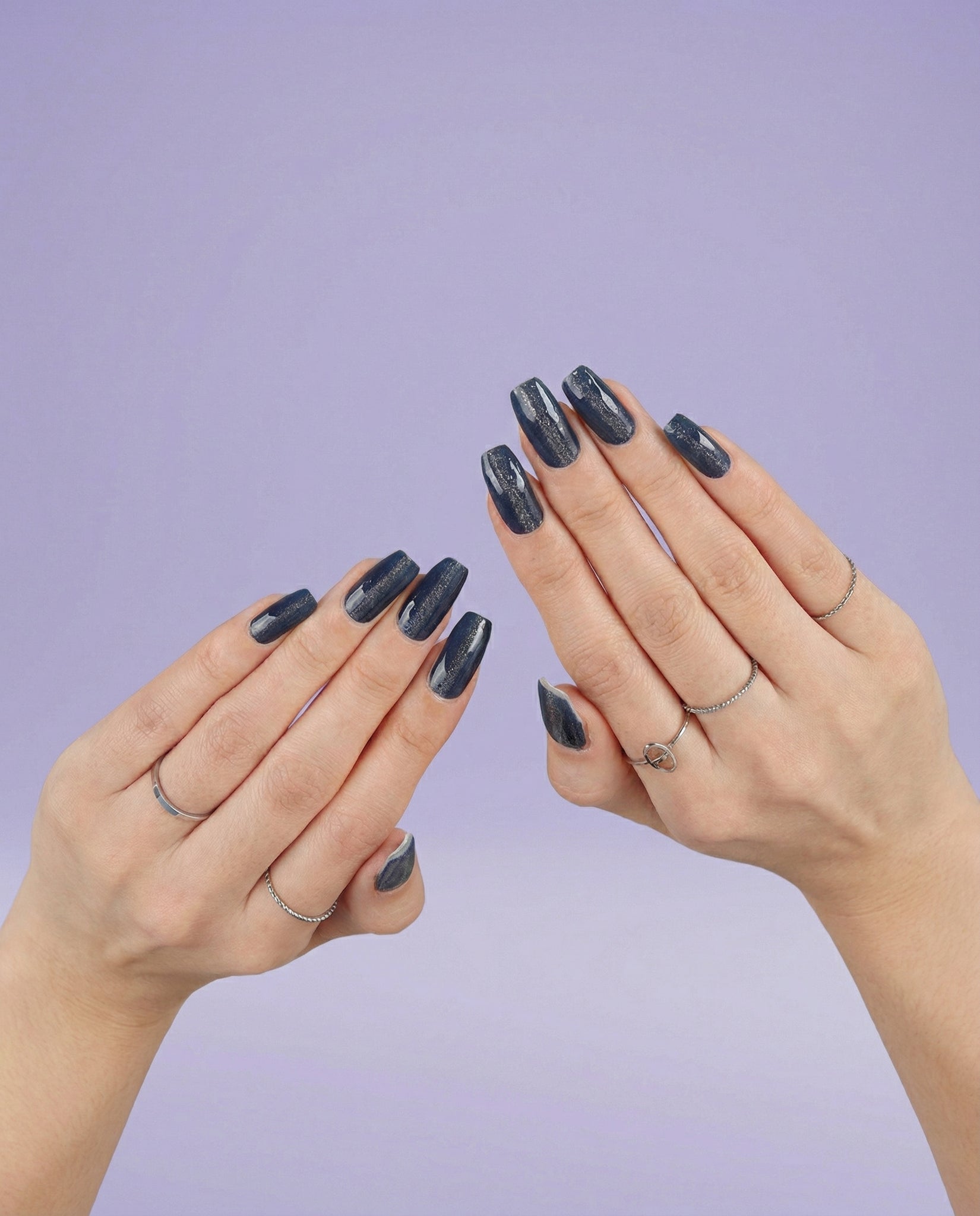 That feeling just before a night out when you look in the mirror and think — yes, that's it. Deep navy with a silver streak that shifts across each nail like light on water. Midnight Indigo is for the evenings you want to feel a little mysterious, and pull it off effortlessly.